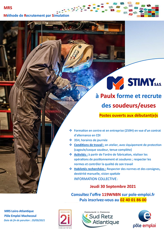 Toutes les personnes intéressées par la formation « soudure » peuvent s’inscrire à la réunion d’information collective organisée par Pôle emploi Machecoul Saint Même. Elle aura lieu le jeudi 30 septembre au sein de l’entreprise Stimy, avec une présentation du métier et une visite de l’entreprise. La sélection des candidats se fera par le biais d’exercices d’habiletés et d’aptitudes avec la Méthode de Recrutement par Simulation (MRS). Développée par Pôle emploi, la MRS permet aux entreprises de recruter des candidats adaptés au poste de travail, sans tenir compte de leur diplôme, de leur expérience ni de leur CV. Les candidats intéressés peuvent se renseigner auprès de leur conseiller Pôle emploi.