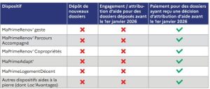 Les dossiers ayant fait l’objet d’une notification d’attribution avant le 1er janvier 2026 peuvent démarrer leur chantier ou le poursuivre. Les demandes de paiement et d’avance pourront être déposées sur la plateforme. Elles seront examinées puis réglées.